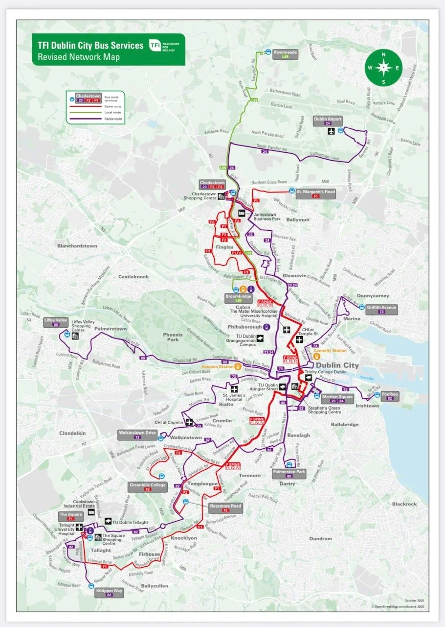 Phase 7 of “BusConnects” in Dublin was implemented in October 2025 and introduced 9 new routes, as shown on the map. 10 existing services were withdrawn with routeing changes to 2 others. The new “F Spine” routes (F1, F2 & F3) are shown in red, local “L” routes in green and radial services in purple.