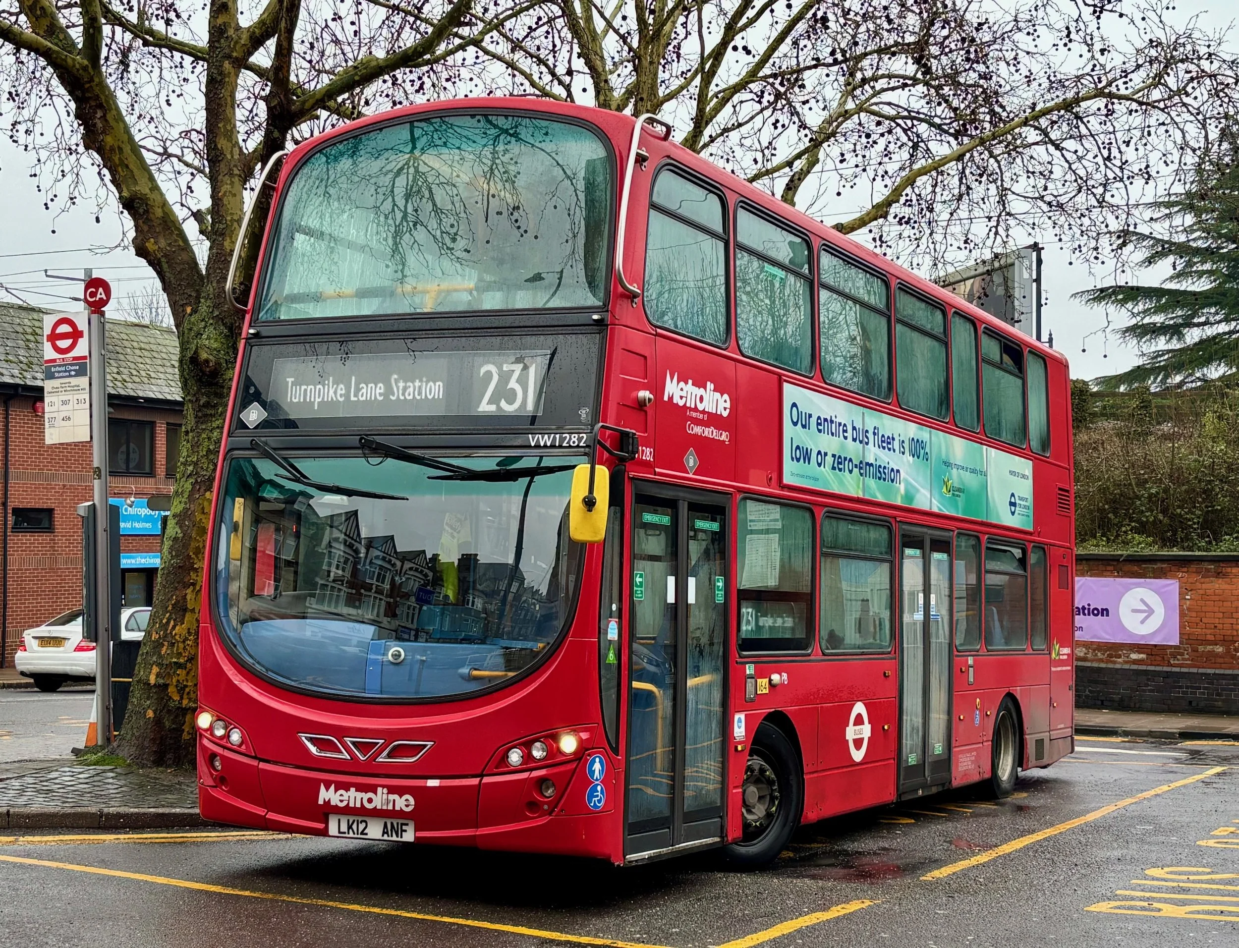 Metroline VW1282 of Potters Bar (PB) Garage on the 231 at Enfield Chase Station after I rode it back from Turnpike Lane. This was considerably quicker than the alternative 329 which was experiencing severe disruption as mentioned in the text.