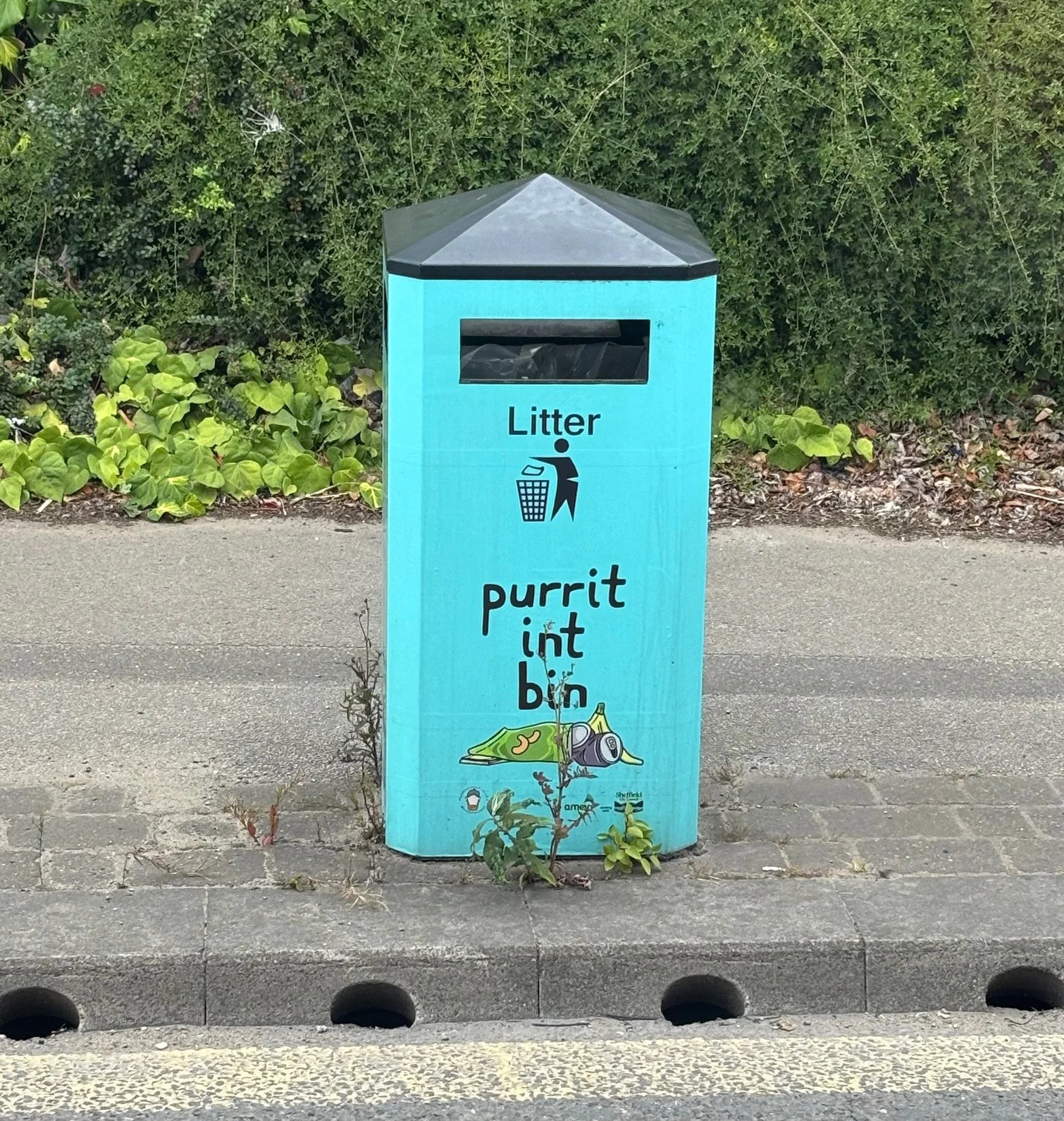 These litter bins are a common sight at Bus Stops in Sheffield and rely on the local vernacular to get the message across!
