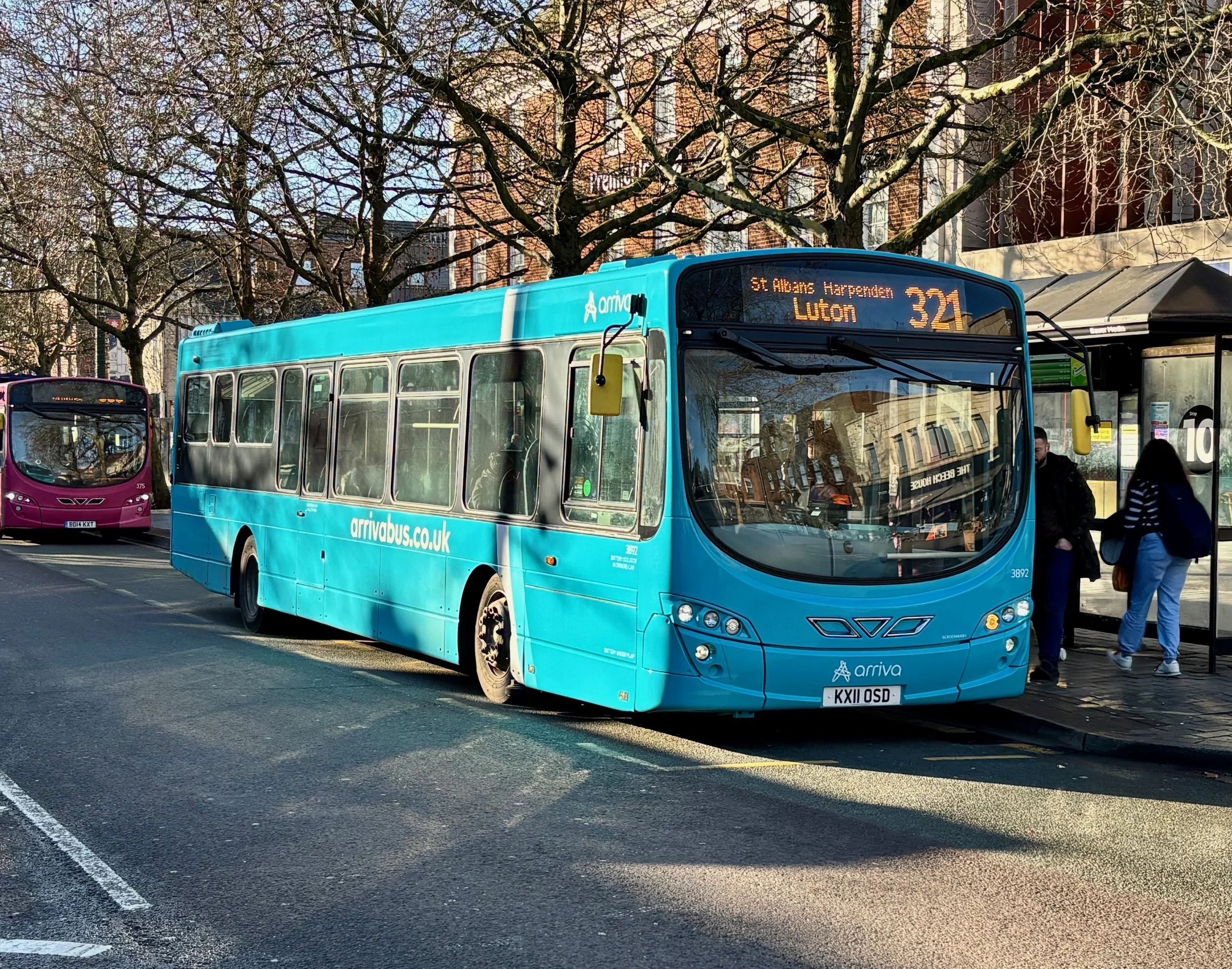On the day I travelled, a couple of the latter were out, so I duly boarded fleet no 1493 (ex London United ADE40426) at Edgware for the short southbound run to Colindale Superstores, a 10 min trip with the low winter sun in my eyes most of the way and precluding seeing much on the journey. After the 15 min layover, I rejoined the same bus for the full trip through to Borehamwood. The driver appeared to be route learning, as a colleague was with him giving directions and pointing out the significant features to be aware of when driving on this service. We picked up a reasonable load in Burnt Oak, presumably due to a gap in the parallel 32 and 142 routes over this section.