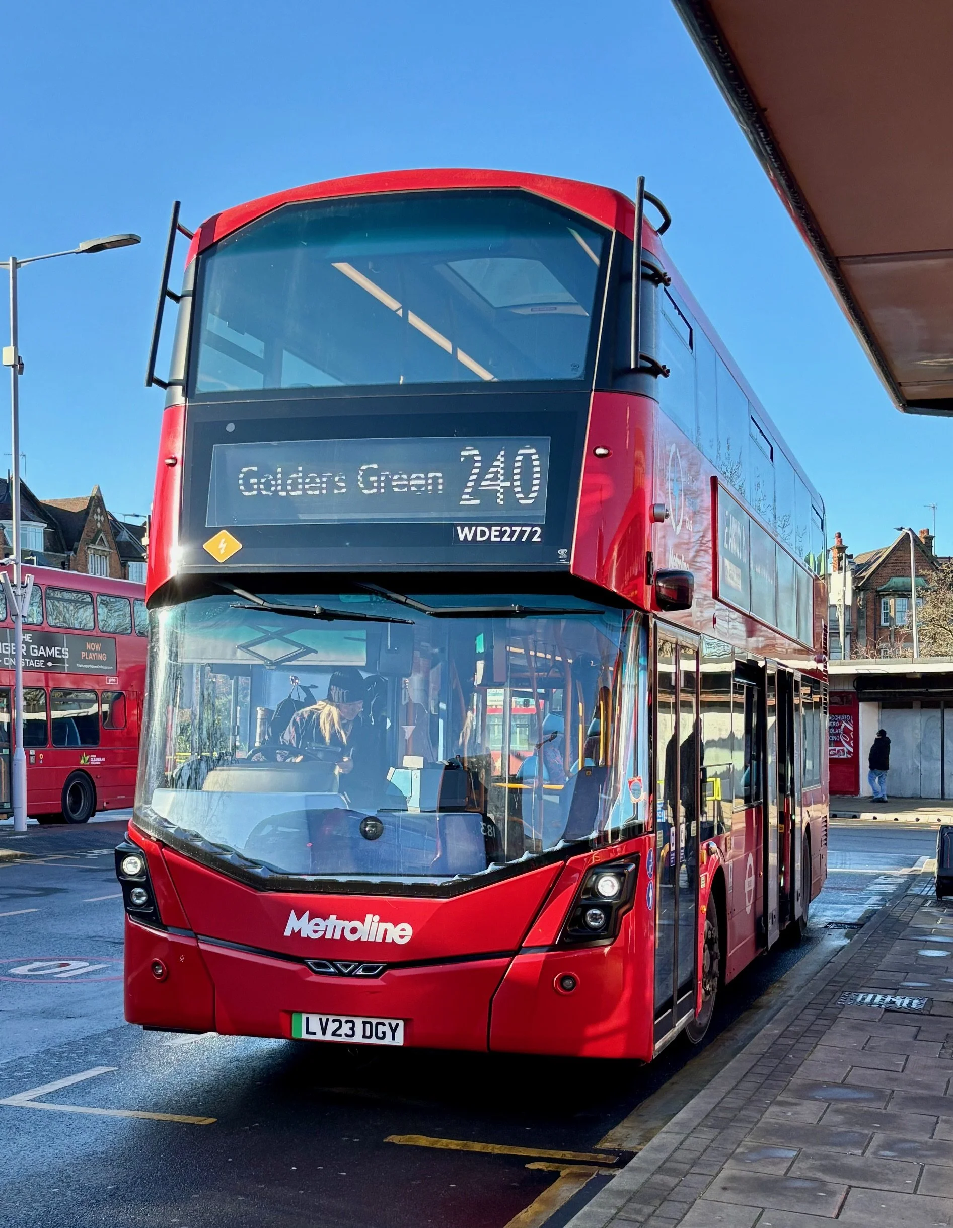 The 240 has been retained by Metroline on retender from April 2026 on the basis of new electrics. However, its former diesels were replaced earlier in 2025 by spare Wright StreetDeck Electroliners, like WDE2772, seen on arrival at Golders Green Station after my ride on it from Edgware.