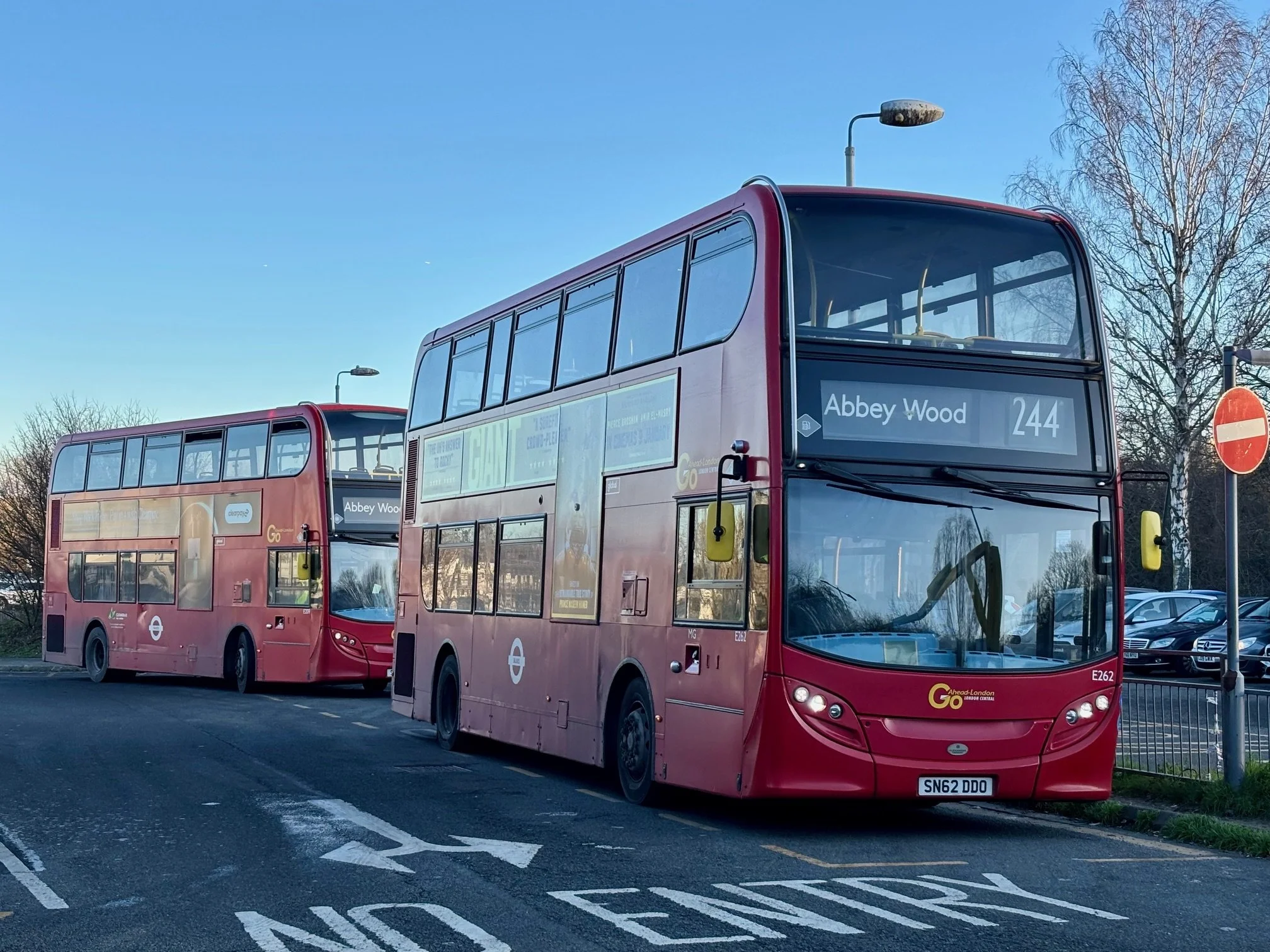 The 244 contract was renewed with Go Ahead London from 6th December 2025 but with an upgrade from single to double deck. Enviro400s E262 and E209 of Morden Wharf (MG) Garage illustrate as they share the stand at Queen Elizabeth Hospital, Woolwich Common.