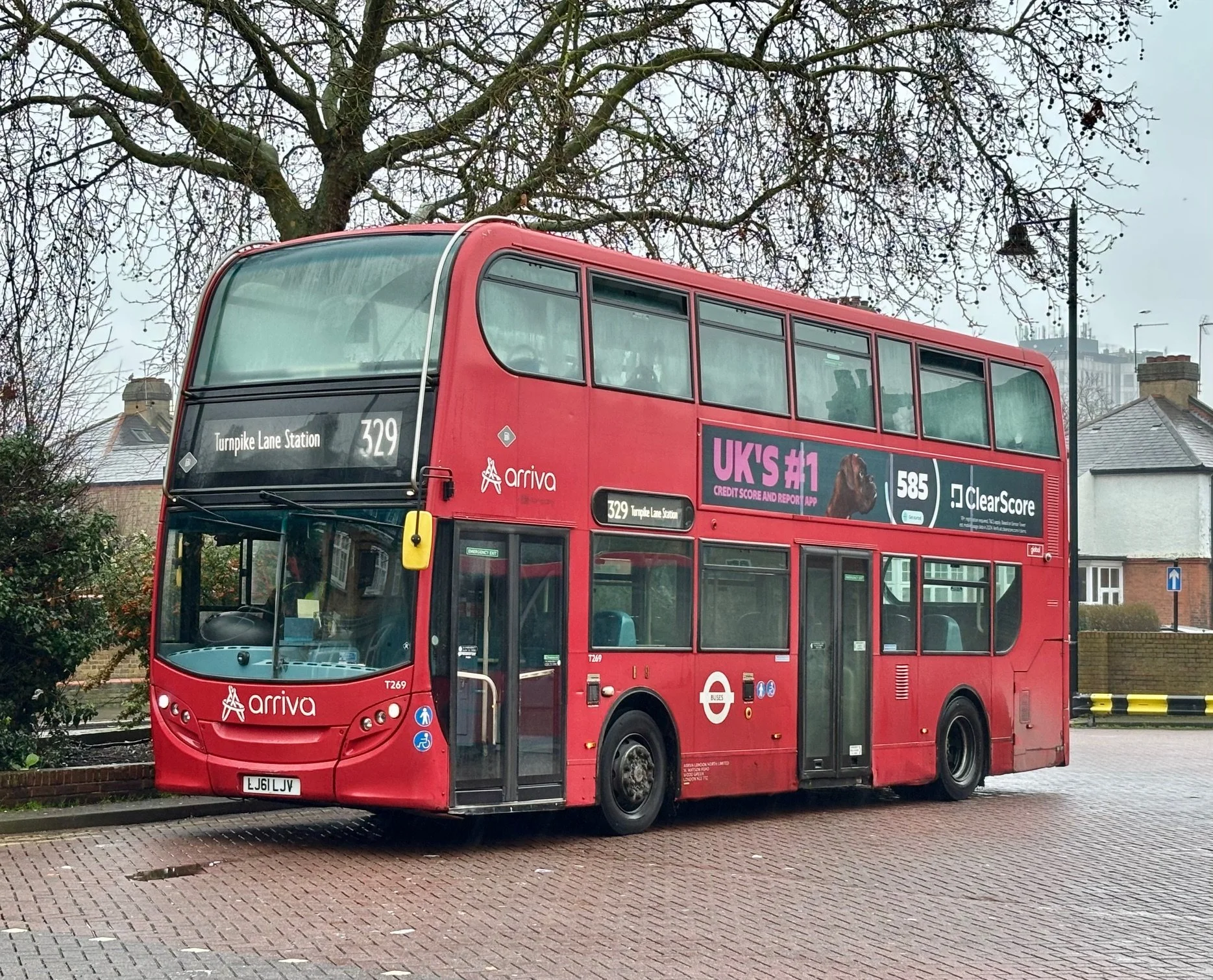 Stormy weather at Enfield Little Park Gardens, with Arriva London Enviro400 T269 of Wood Green (WN) Garage in the rain on the 329 after a long gap in service.