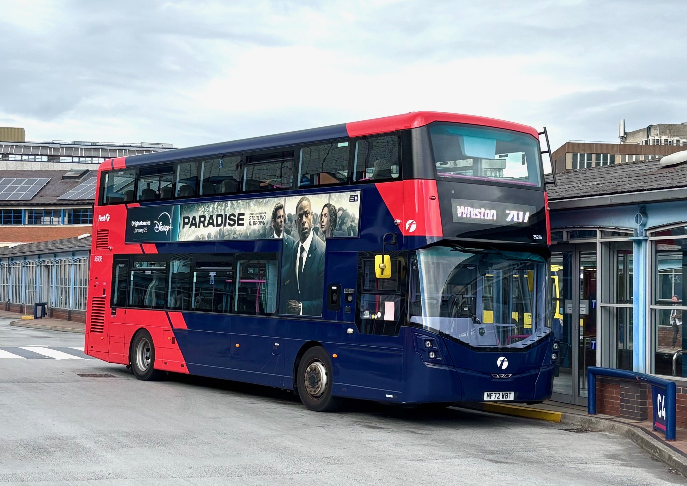 This vehicle is one of a small number transferred from First York with reduced height for passing under a low bridge on the route.