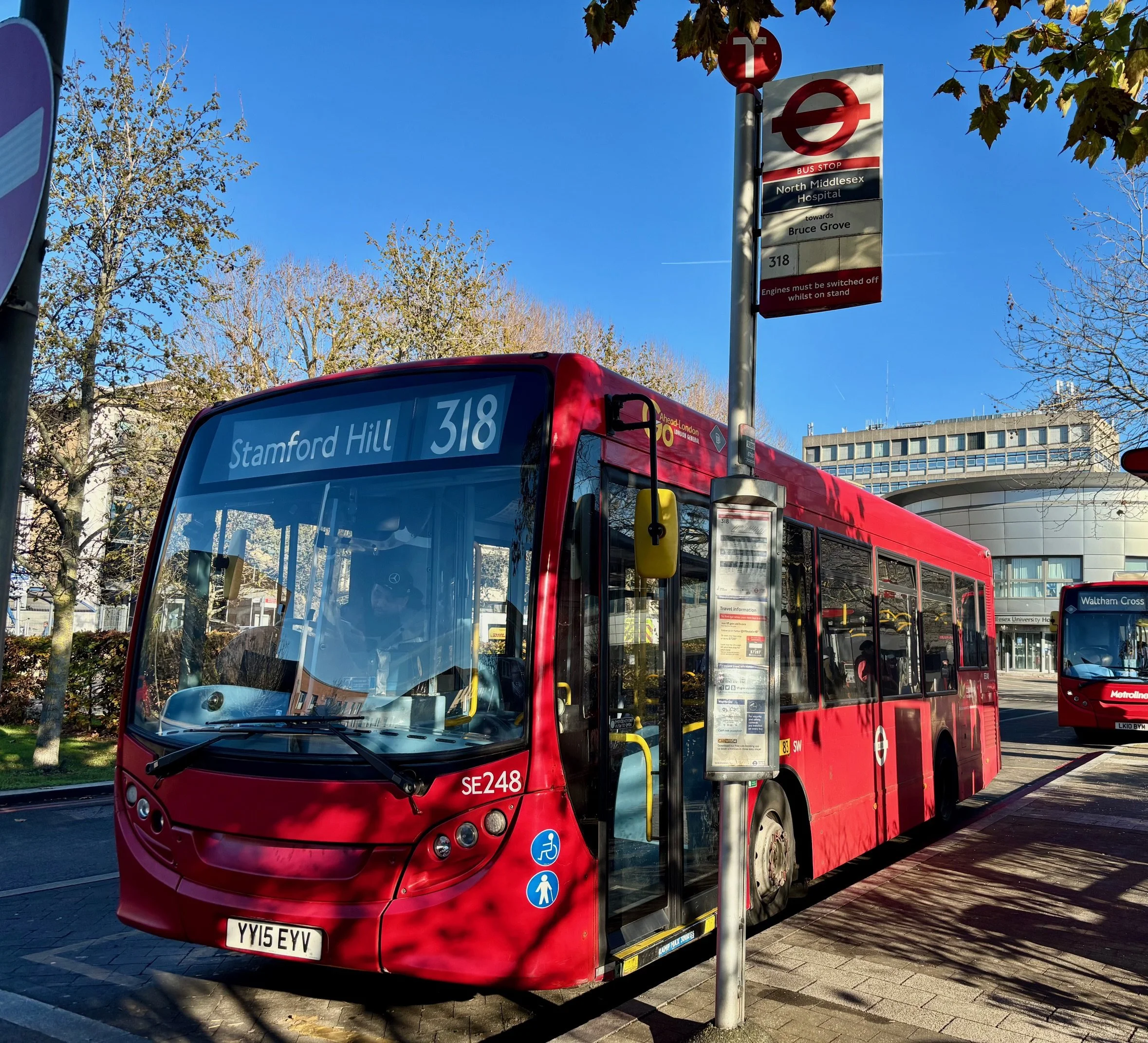 8th November 2025 saw the 318 move from Arriva to GAL, also out of NP Garage. Single door Enviro200 SE248 is at North Middlesex Hospital before I rode it to Stamford Hill.