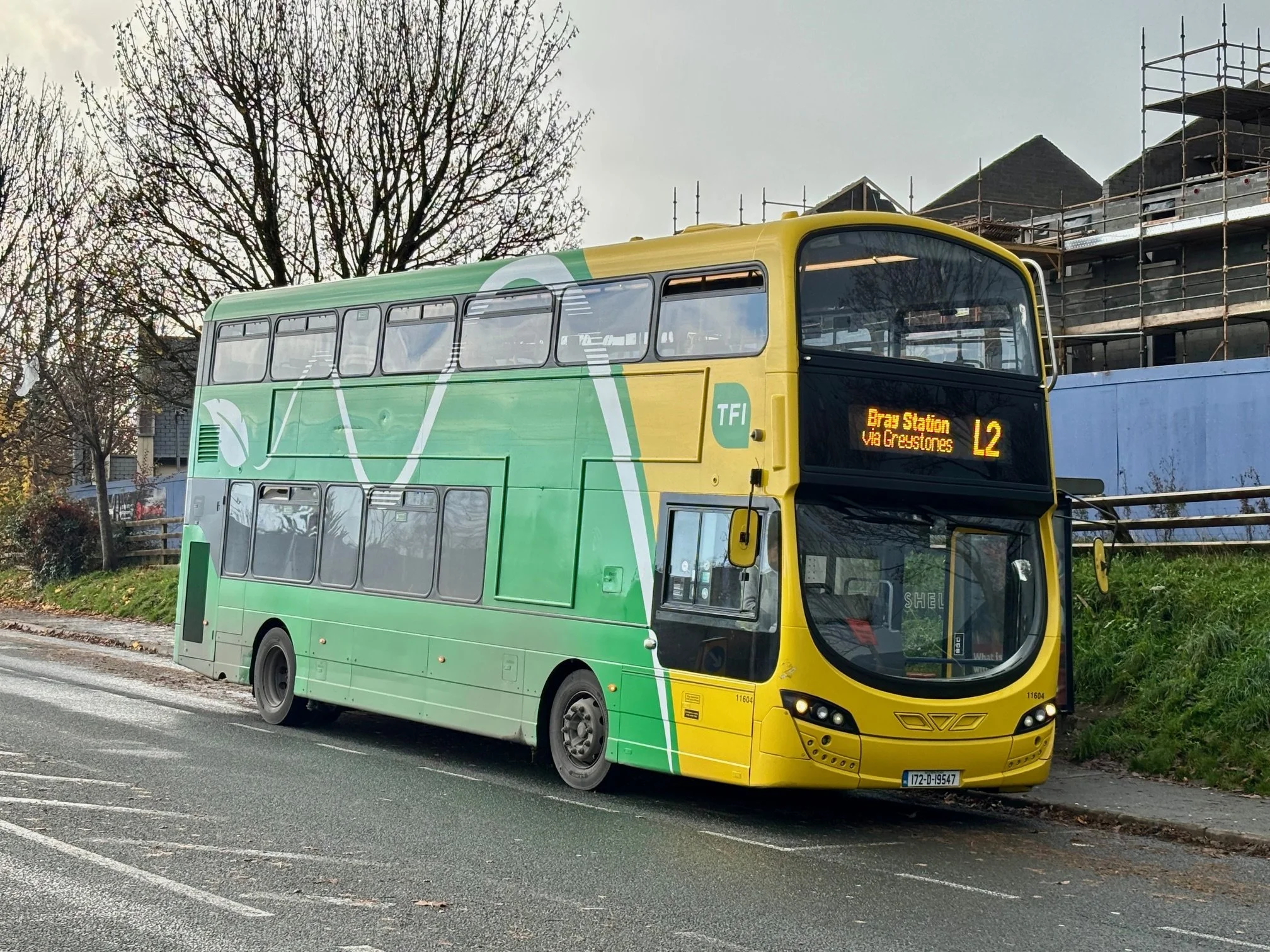 Go Ahead Ireland Volvo B5TL fleet no 11622 at the Newtownmountkennedy (Newcastle Hospital) terminus of local route L1 from Bray. The bus has gained an amount of road dirt on the lower deck sides from traversing country lanes in the area.