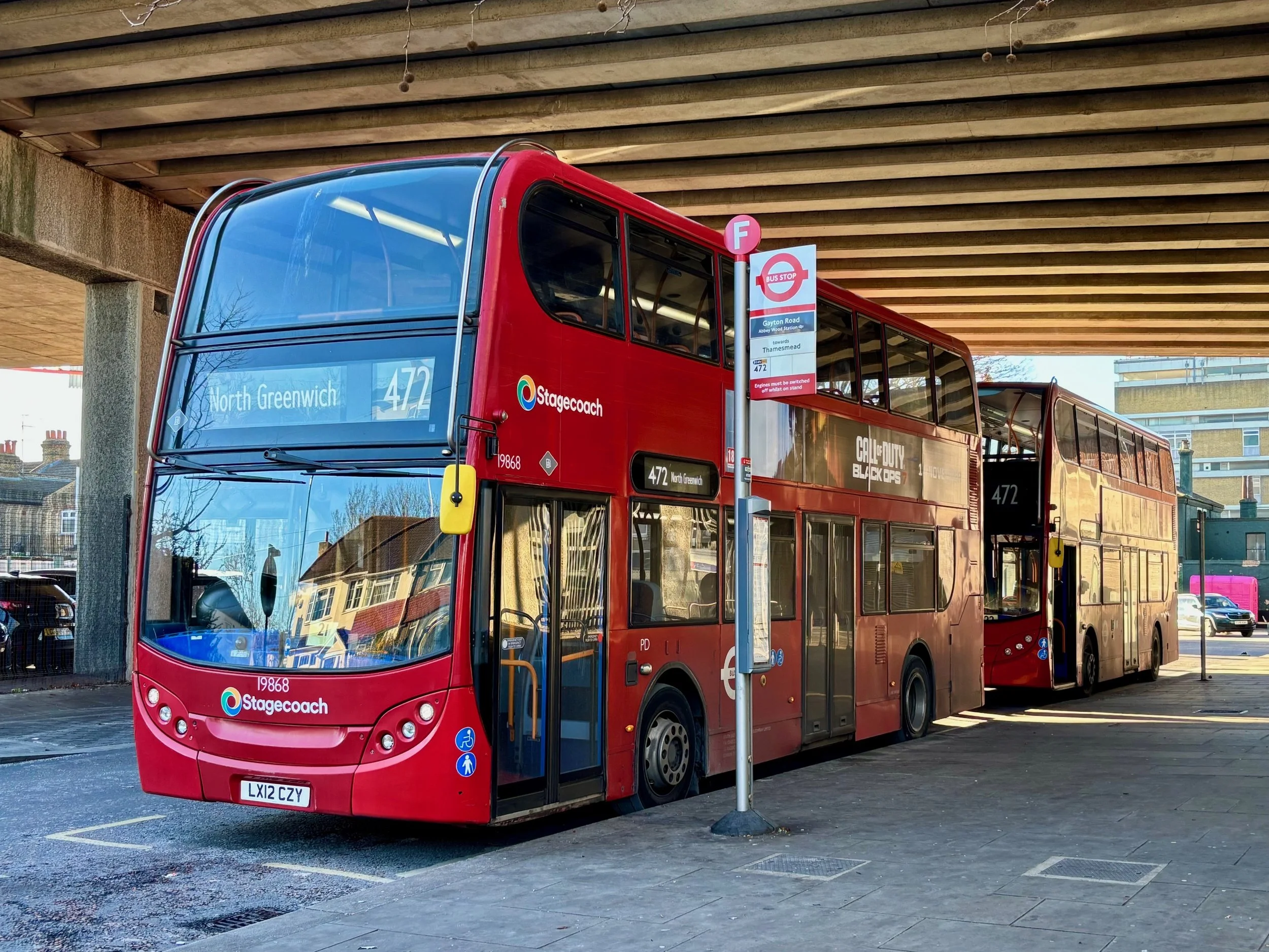A duo of Stagecoach Enviro400s, 19868 and 19817, of Plumstead (PD) Garage on the Route 472 stand at Abbey Wood Station beneath the flyover. I had just arrived here on the second bus.