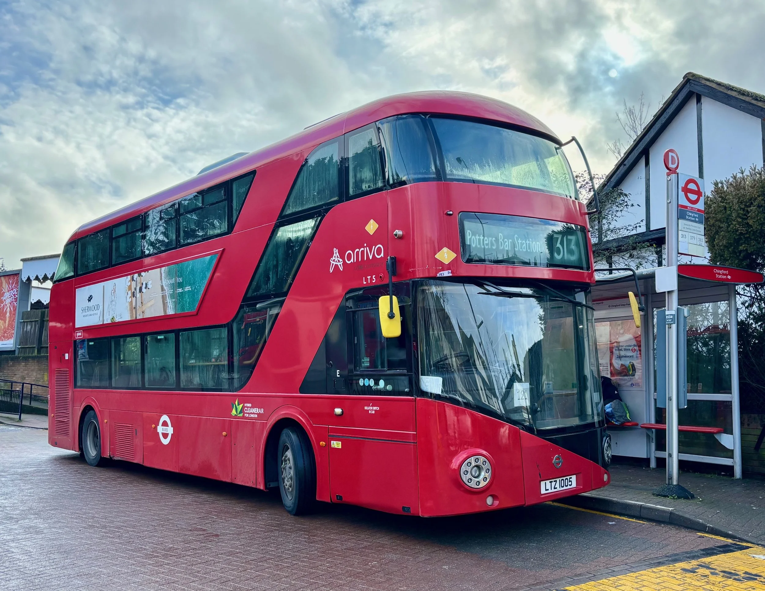 At Enfield Chase, I simply crossed the road to the stop near the War Memorial to await my next bus, on Route 313 to Chingford Station. This service has been retendered recently and is due to pass to Metroline with existing electrics later in 2026, so this was maybe my final opportunity before then to ride the route whilst it remains with Arriva at Enfield (E) Garage. Unusually, the allocation mainly comprises NRMs, which look distinctly out of place on this semi-rural run on the northern fringes of the TfL network. However, DW diesels are often out in support, mostly at least one and sometimes more appearing each day.