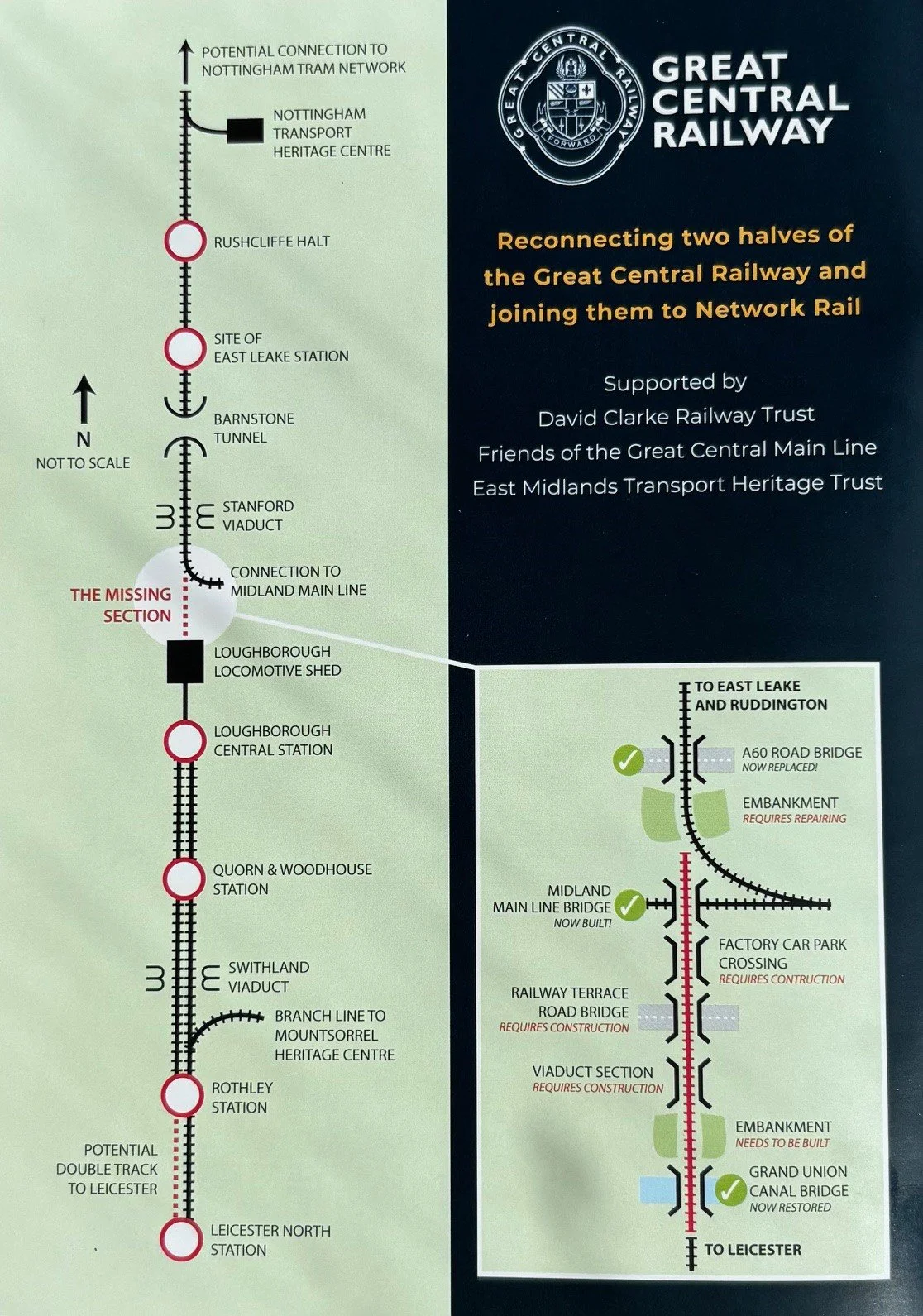 Meanwhile, a separate heritage railway known as the Great Central Railway (Nottingham) exists over the northern part of the line between Ruddington (on the outskirts of Nottingham) and a point just north of Loughborough. There are plans to reconnect the two lines, which are described at the end of this article.