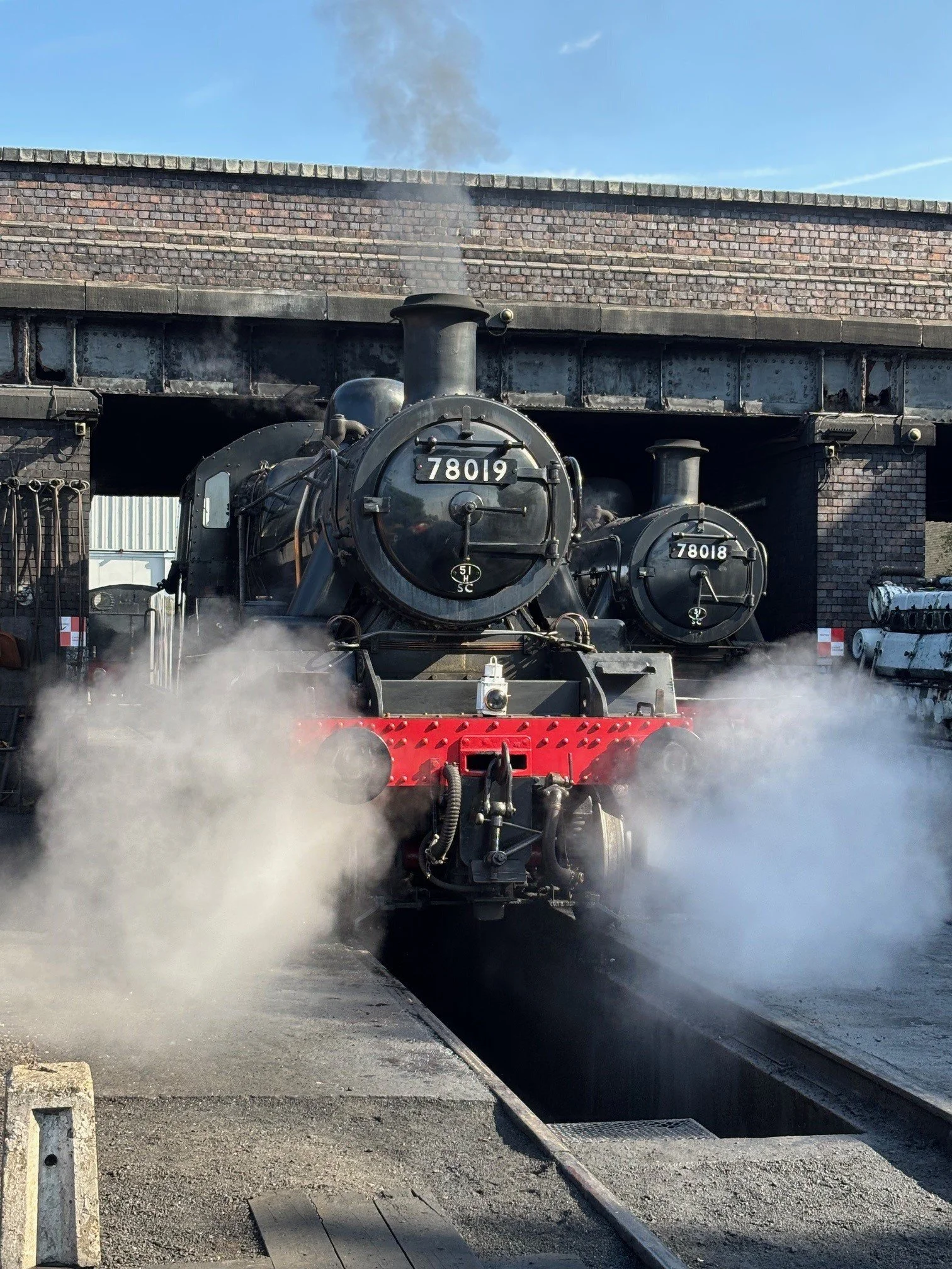 British Railways Class 2MT 78019 being prepared for service outside Loughborough Loco Shed on the day of my visit, with classmate 78018 alongside.