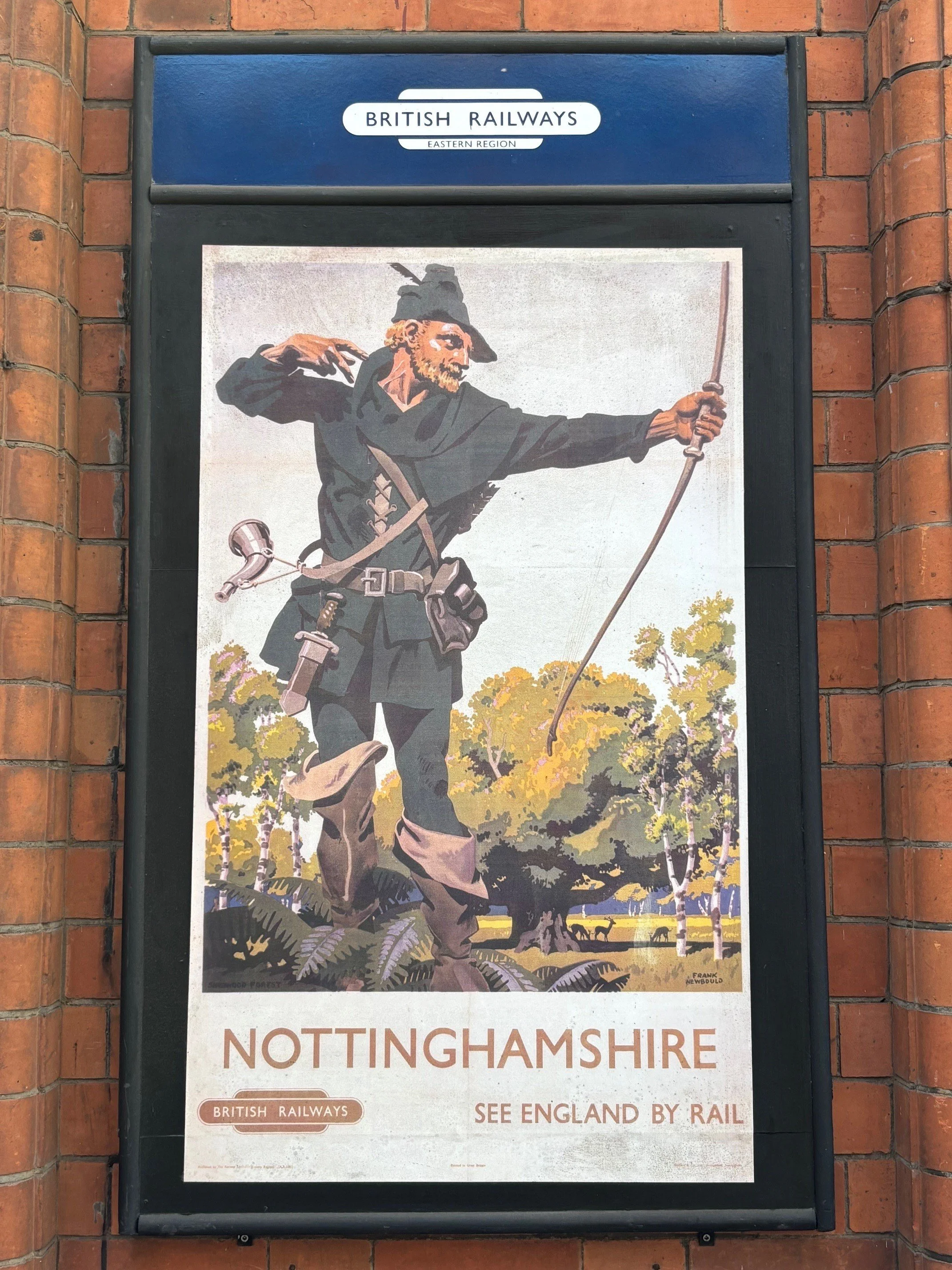 Historical posters appear on the platform billboards, such as this British Railways era example depicting the delights of nearby Nottinghamshire.