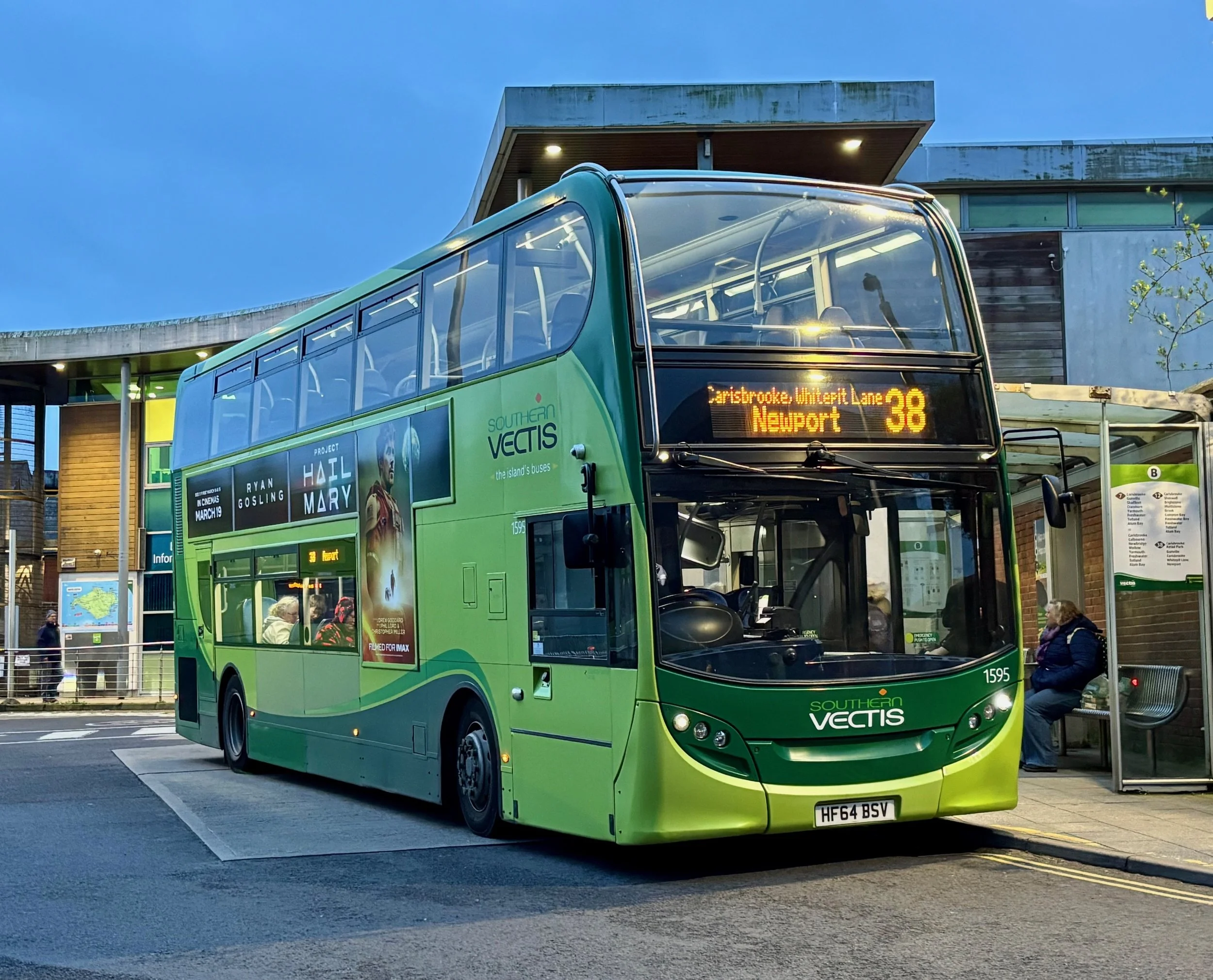 My final ride on Day 1 was a quick spin on Newport Local Route 38, which operates as a circular via Carisbrooke. Enviro400 1595 was the vehicle and is seen at the Bus Station as dusk falls.