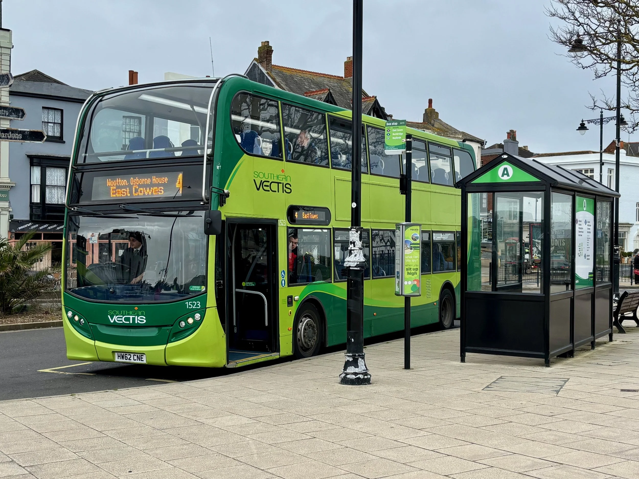 Back at Ryde, there was just time to finish off with a final trip, a return to East Cowes and back on Route 4. This operates Hourly daily including evenings and, as mentioned earlier, interworks with Ryde Town service 37. My last bus of this adventure was another Enviro400, no 1523, which was waiting at Stop A in the Interchange, so I hopped on with a handful of others and we departed on time.