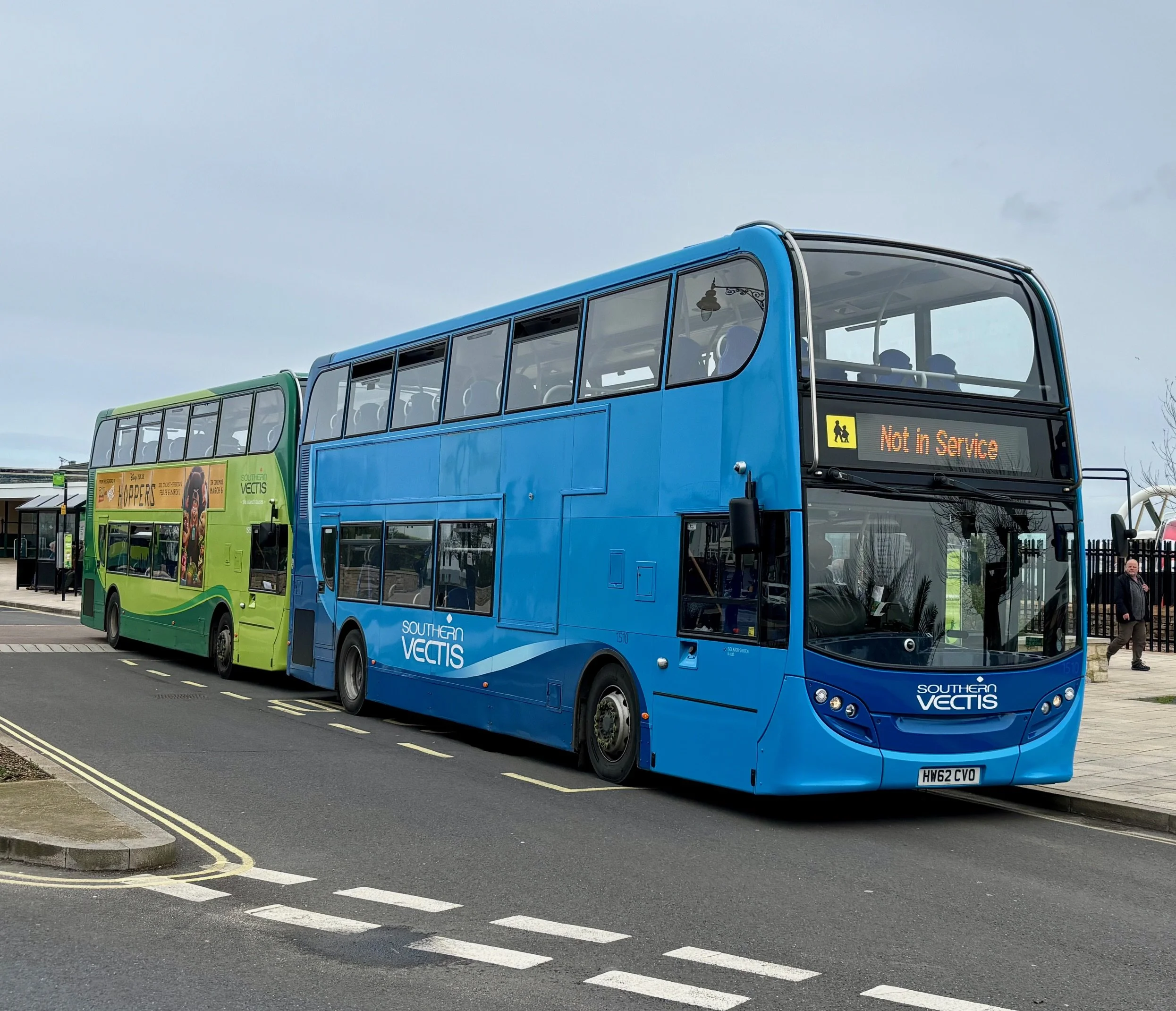 A handful of vehicles are in “Vectis Blue” livery, including Enviro400 fleet no 1510, seen here between school duties at Ryde Interchange, parked up with a fellow Enviro in standard livery.