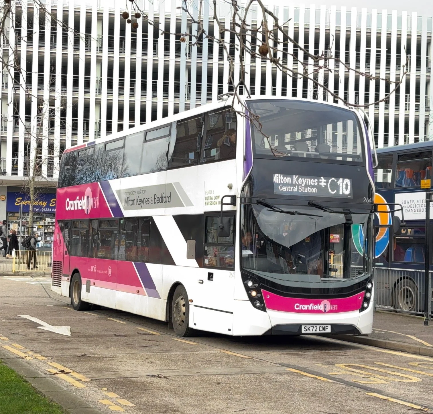 UNO operate a series of services between Bedford and Milton Keynes via Cranfield University. ADL Enviro400 MMC in “Cranfield Connect” livery prepares to depart from Bedford Bus Station on the C10 variant.