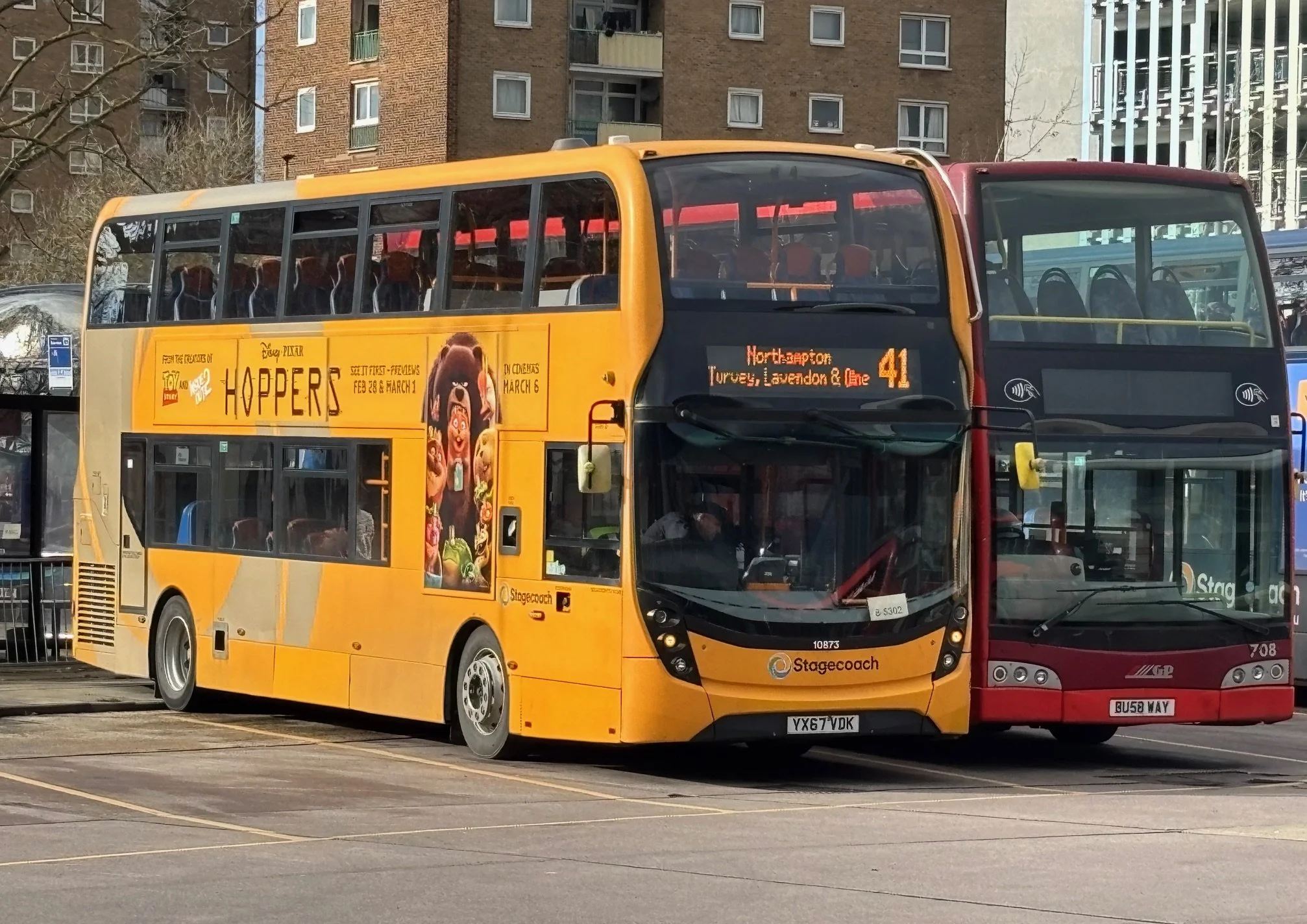 Enviro400 MMC 10873 in Stagecoach “Distance Livery” at Bedford Bus Station on Route 41 to Northampton. The route was due to pass to Grant Palmer from 2nd March 2026, whose Volvo B9TL Optare Olympus 708 is seen out of service on the right.