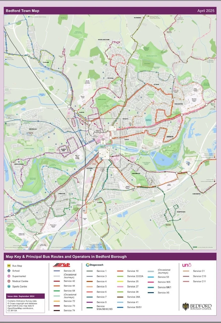 Bedford Bus Map showing the principal routes in the borough. Includes services by the main operator, Stagecoach, plus those of Grant Palmer and UNO.