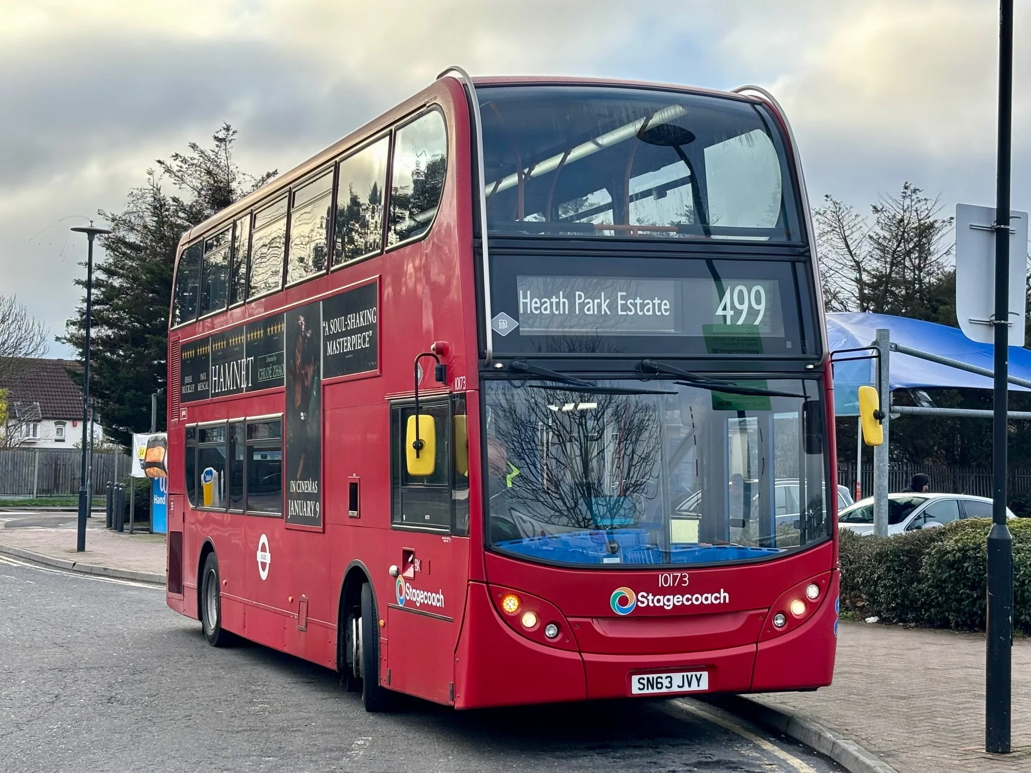 The conversion of the 499 from single to double deck in 2025 is demonstrated here by Enviro400 fleet no 10173 of Rainham (RM) Garage, also captured at Gallows Corner Tesco.