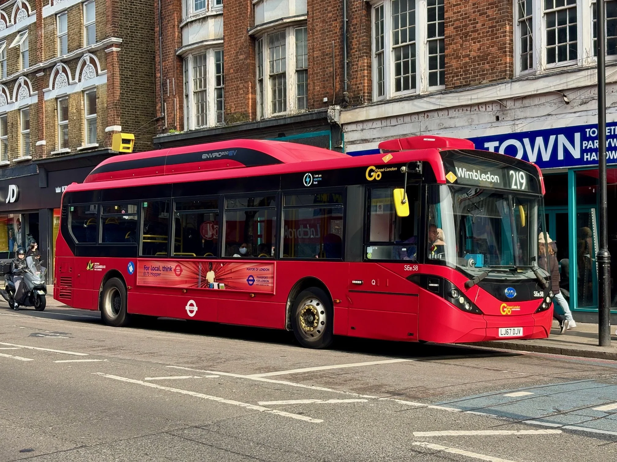 The 219 contract was renewed with GAL in May 2025 using existing Enviro200 EVs which replaced its former Wright Streetlites. I travelled on a newer example, but SEe58 is seen mid route at Tooting Broadway later in the day bound for Wimbledon.