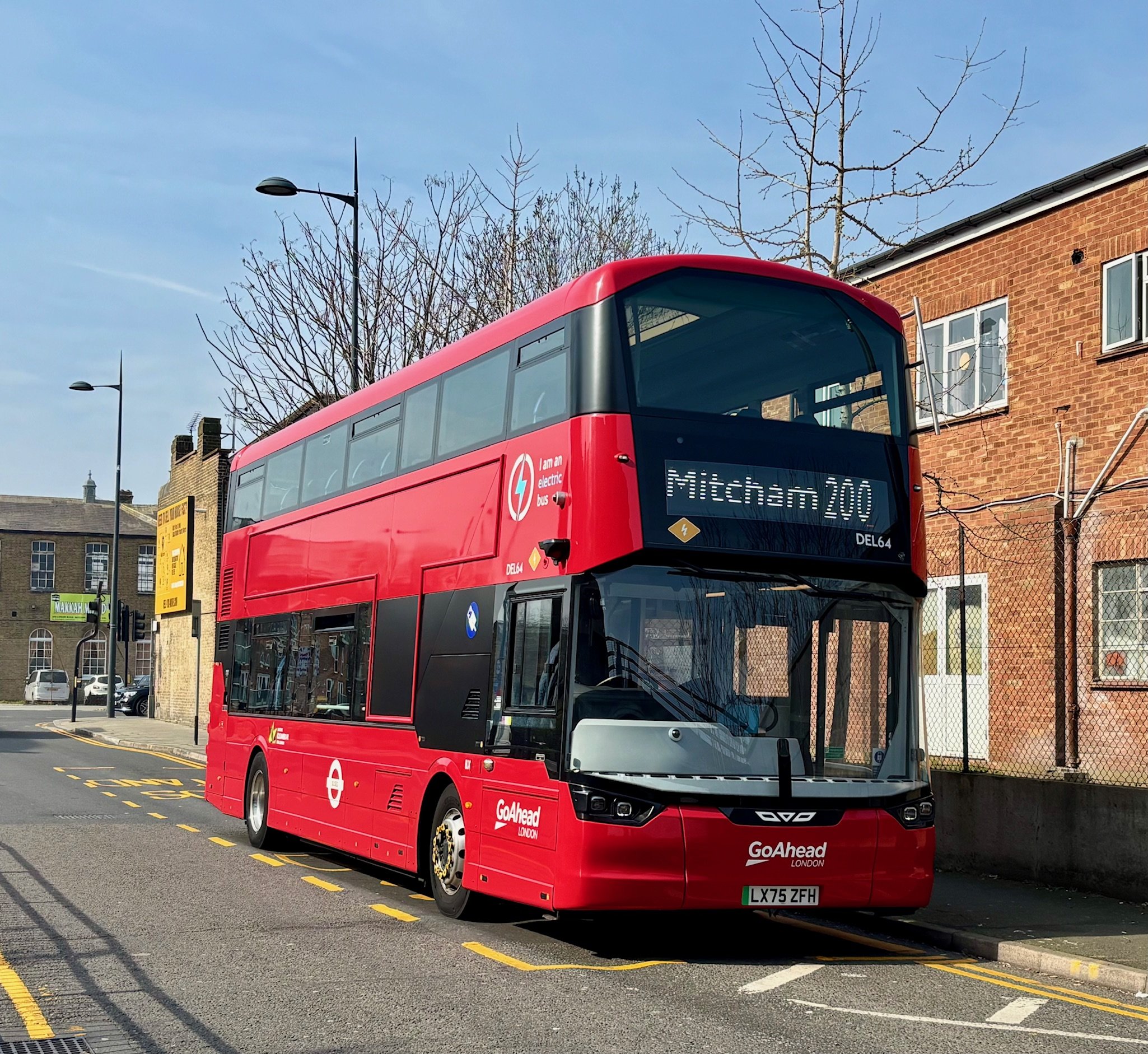 GAL Wright StreetDeck Electroliner DEL64 of Merton Garage represents the incoming order on the 200 and is seen at the Mitcham terminus.