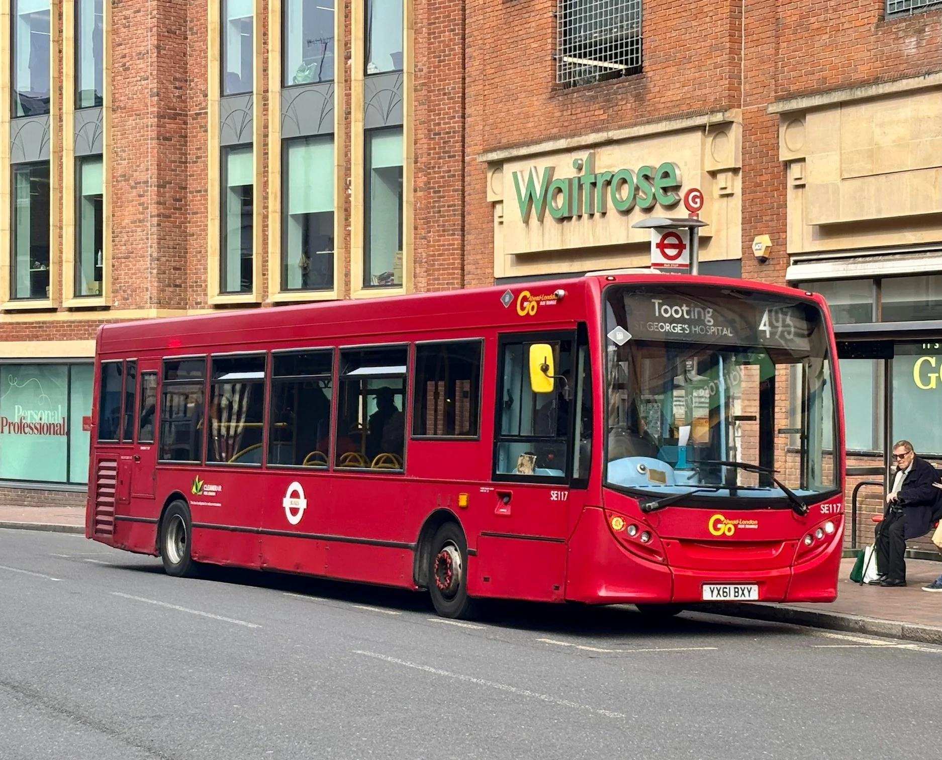 The 493 was due to pass from GAL to Transport UK on retender from 28th March 2026. Just days before this, Enviro200 SE117 of Merton (AL) Garage recalls the outgoing order and is seen outside Waitrose in Richmond after my journey aboard it from Tooting.
